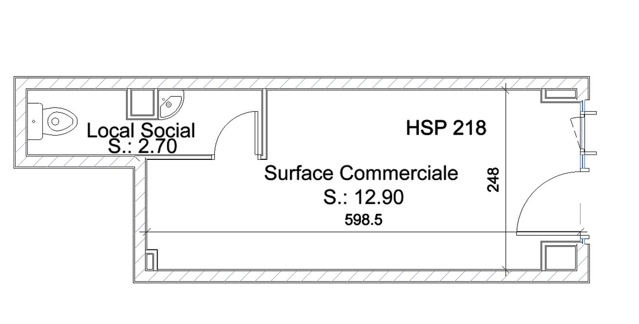 -          D’une surface de 12.90m² avec porte vitrée et vitrine.